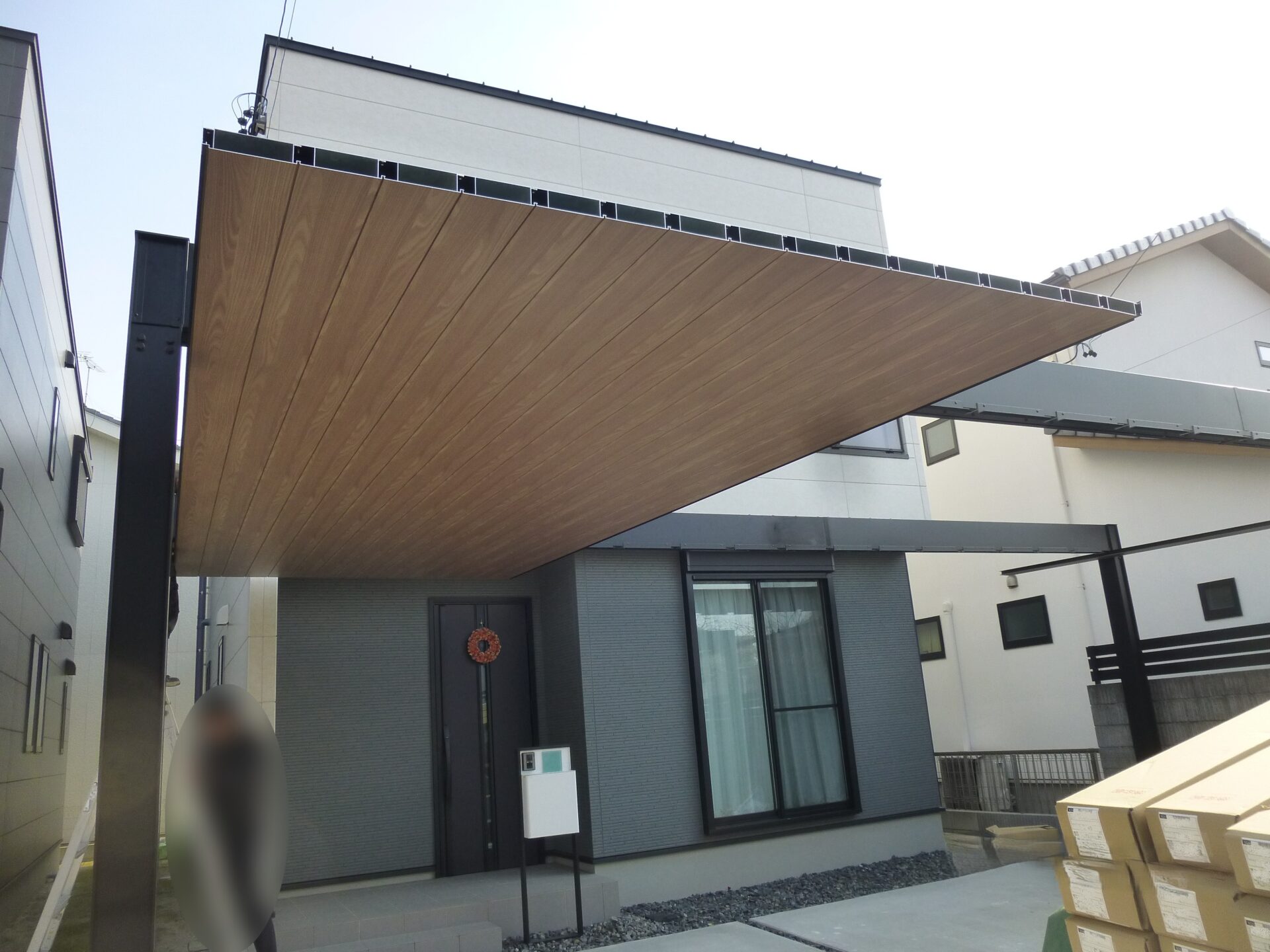 カーポート天井には木調材を取り入れ、無機質になりがちな駐車場にやわらかさをプラス。