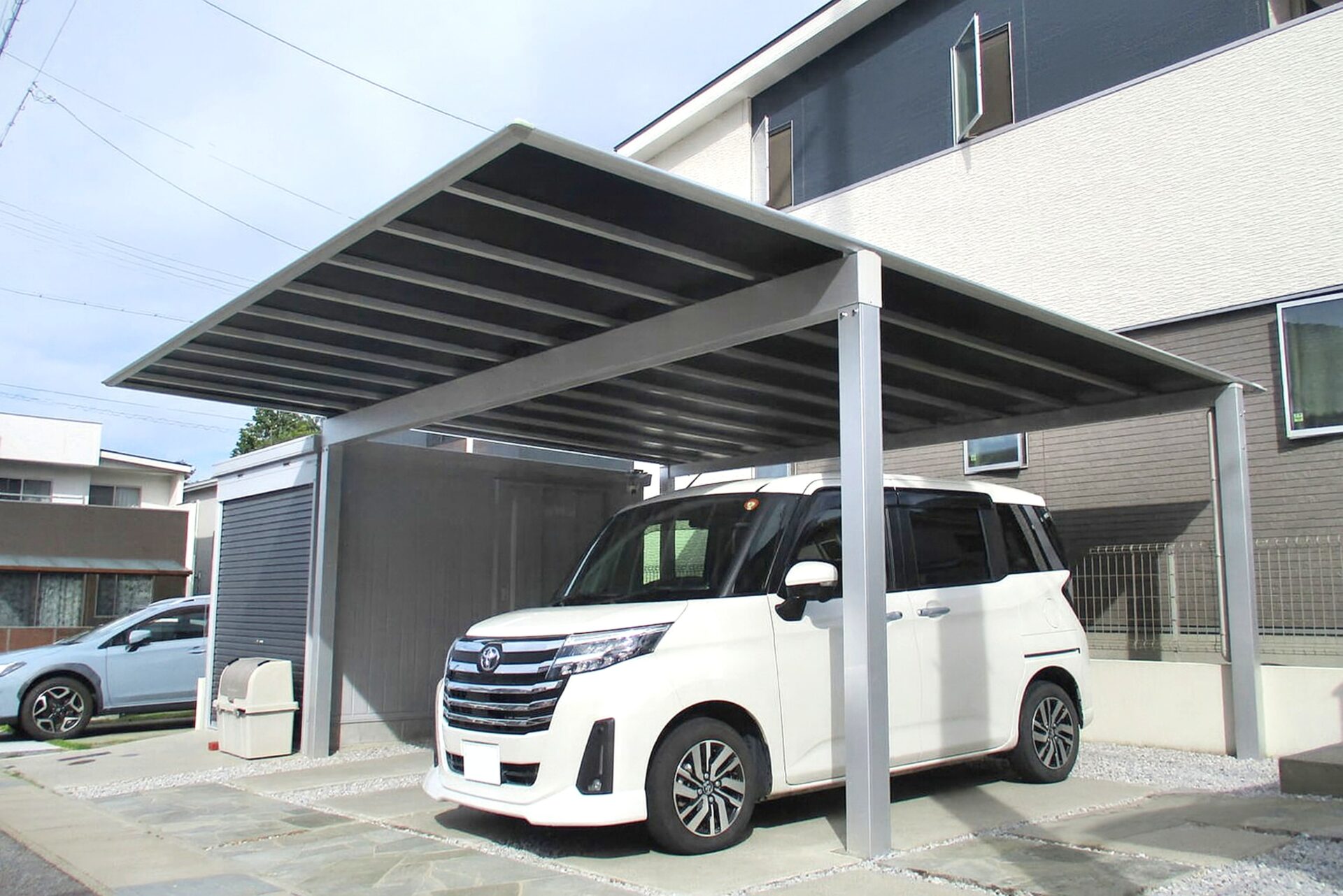 屋根には三協アルミ スカイリード(両支持タイプ)を使用。ブラックポリカ屋根で統一し、既設ガレージとの調和を意識した勾配設計で、機能性と美観を両立しました。ヤマイチならではの丁寧な施工で、長く快適に使えるカーポートに仕上がりました。