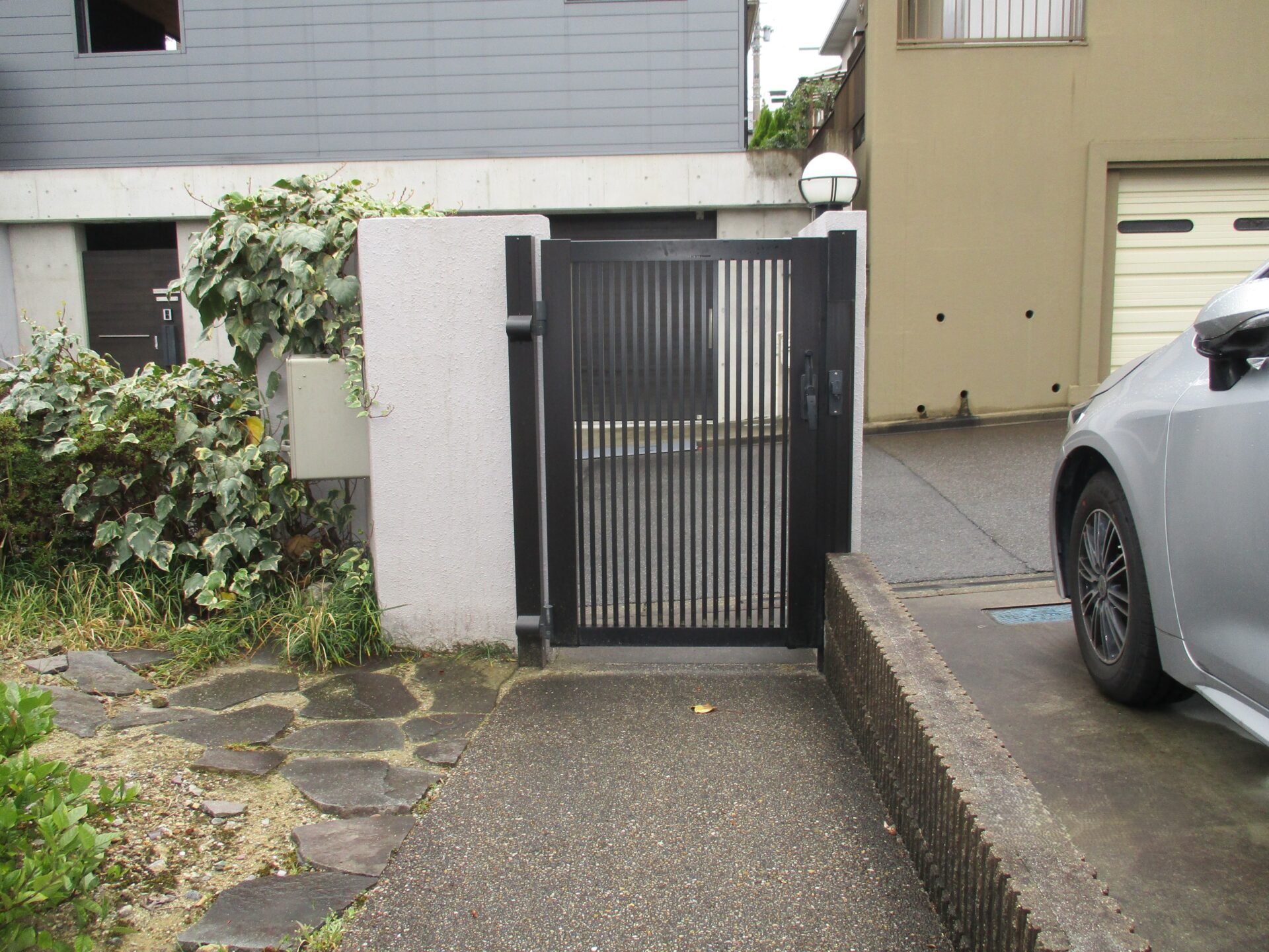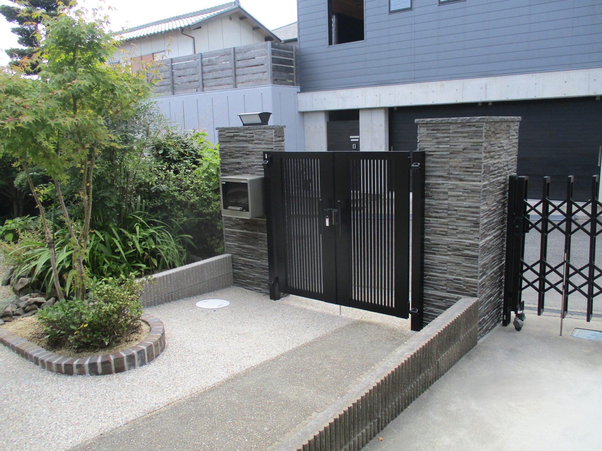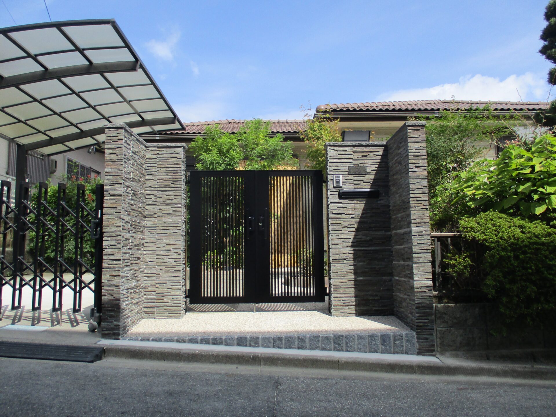 勝手口側の片開き門扉を、天然石を使って高級感を出しながら両開き門扉にリフォームしました。後付け感が出ないようデザインや素材を工夫し、上質で使いやすい外観に仕上げました。