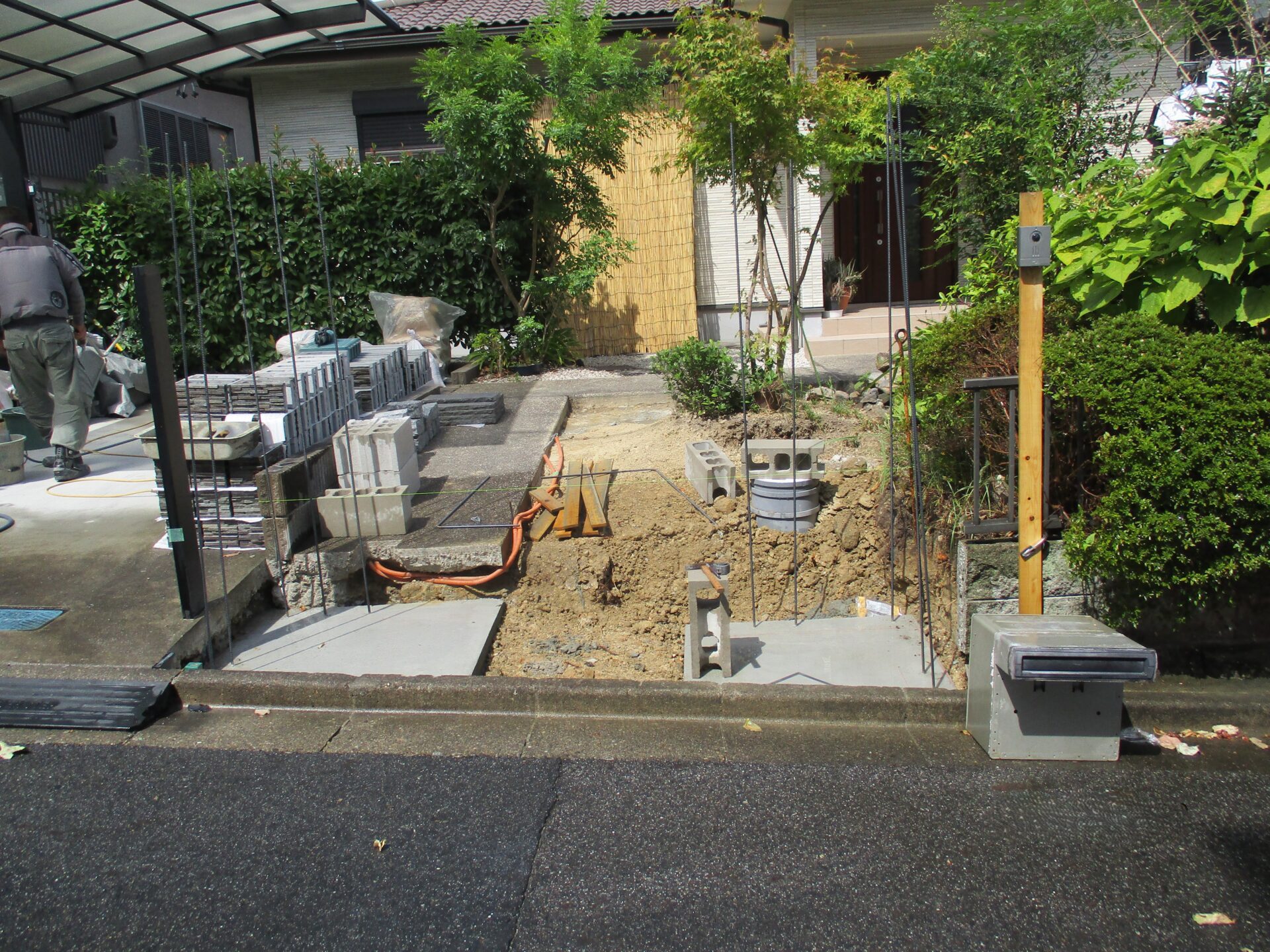既存の車庫土留めブロックやアプローチの高さが決まっていたため、門柱の高さやアプローチの傾斜を調整することが課題でした。さらに右側には間知石があり、設置可能な間口にも制約がある中で、最適な配置と寸法を丁寧に検討しました。