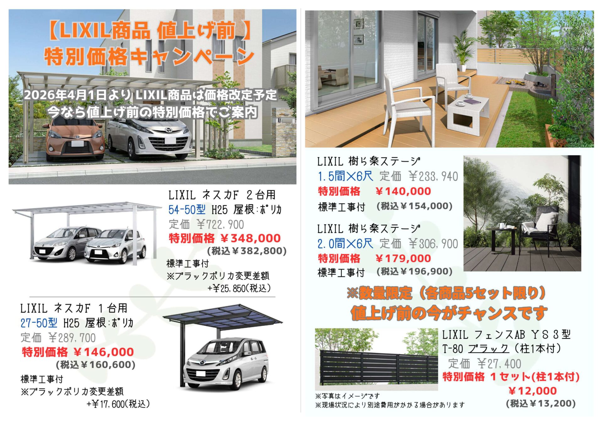 いずれも標準工事付きの特別価格となっており、数量限定(各商品5セット限り)での販売となります。